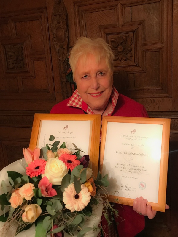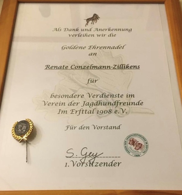 Mir wurde eine große Ehre zuteil, weil ich eine Urkunde für 40 jährige treue Mitgliedschaft bekam und unerwartet wurde mir ein herrlicher Blumenstrauss verbunden mit der Goldene Ehrennadel für besondere Verdienste überreicht. Ich gehörte viele Jahre zum Urgestein auch zu diesem Verein, als Verbandsrichter und Sonderrichter-Schweiss.